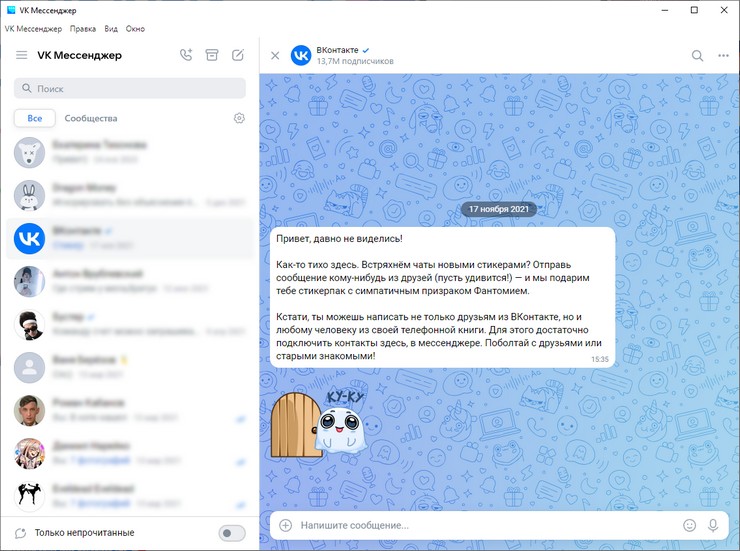 Как постоянный пользователь ВКонтакте, я оценил, как удобно общаться с друзьями в мессенджере. Все контакты под рукой, и можно легко делиться постами и медиафайлами.